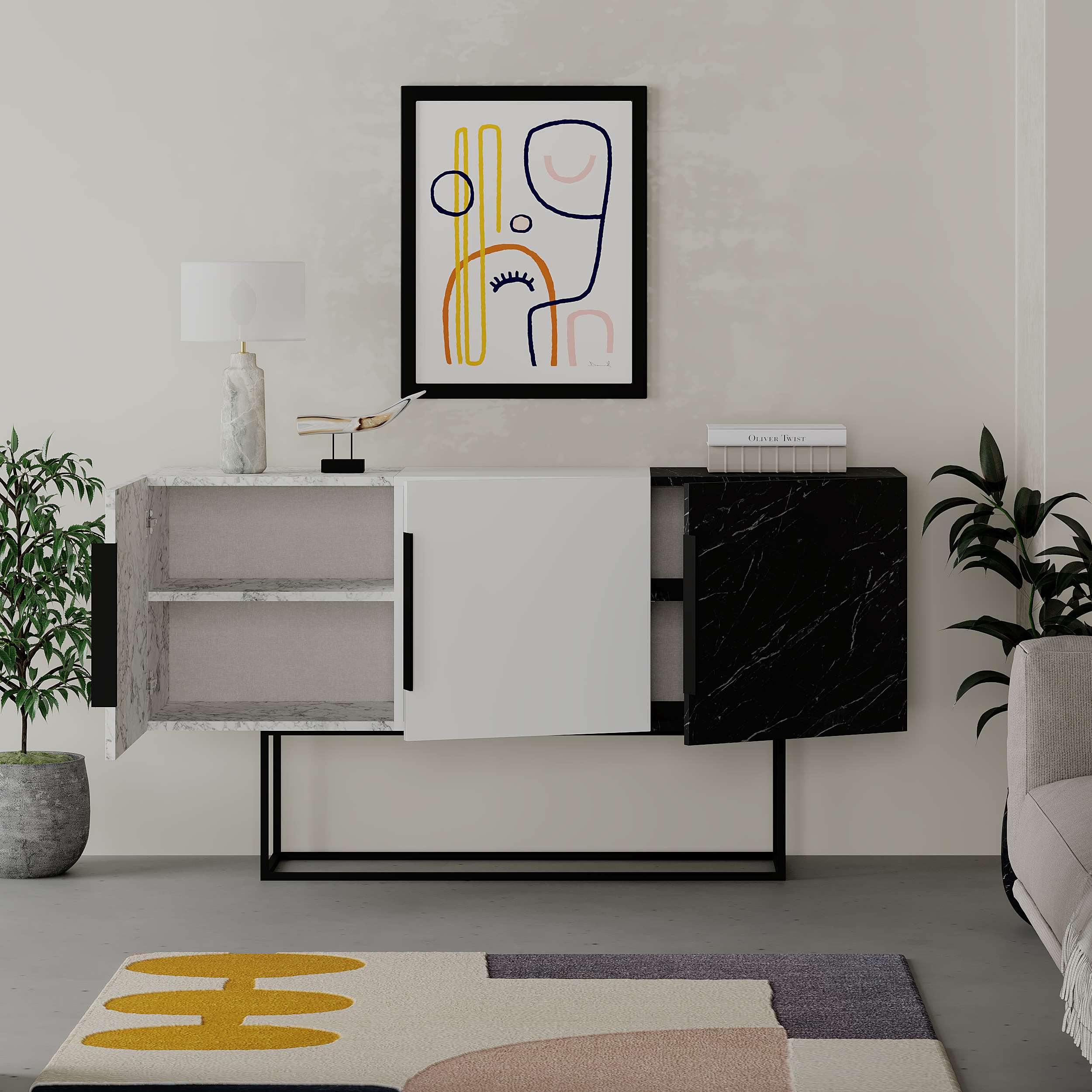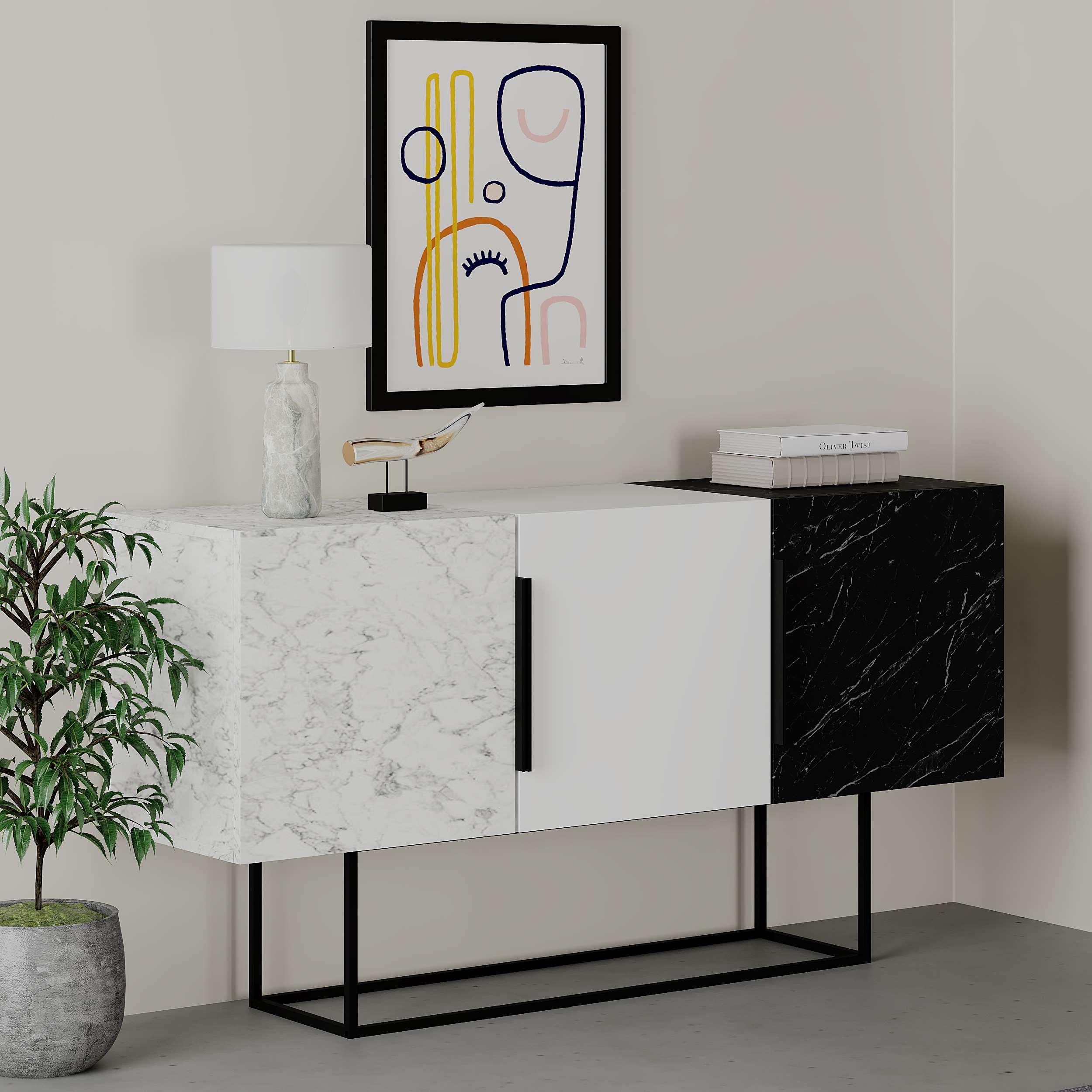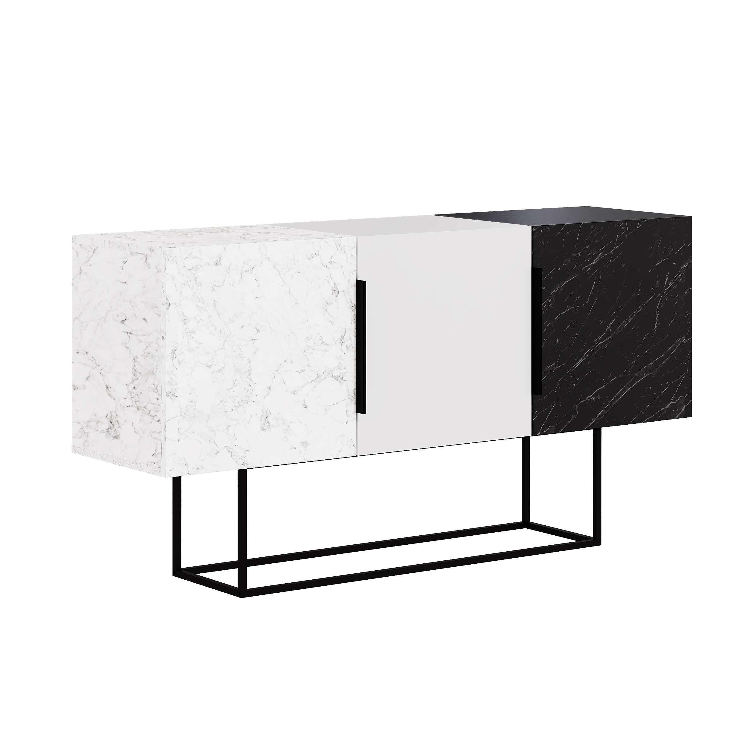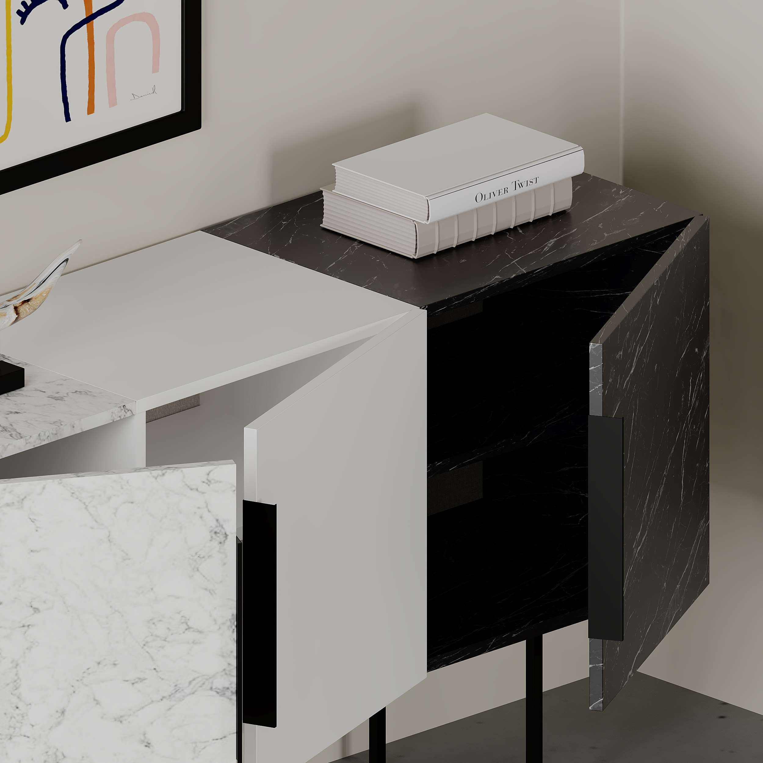✅ Upečatljiva trobojna paleta – Komoda Tontini sastoji se od tri linearno povezana ormarića, svaki u svojoj upečatljivoj boji: lijevi ormarić u boji Carrara mermera, srednji u čistoj bijeloj, a desni u boji crnog mermera, stvarajući moderan i luksuzan vizualni dojam.