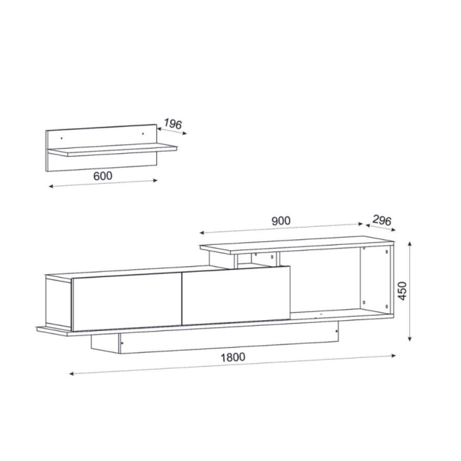 ✅ Jedinstven i funkcionalan raspored – s lijeve strane komode nalaze se dva prostrana ormarića, iznad kojih je smještena dugačka polica. Desna strana služi kao idealno mjesto za TV, a ispod njega se nalaze jedna manja i jedna veća polica za multimedijalne uređaje. Dodatno, zasebna polica iznad TV-a s lijeve strane upotpunjuje jedinstveni izgled i nudi ekstra prostor.