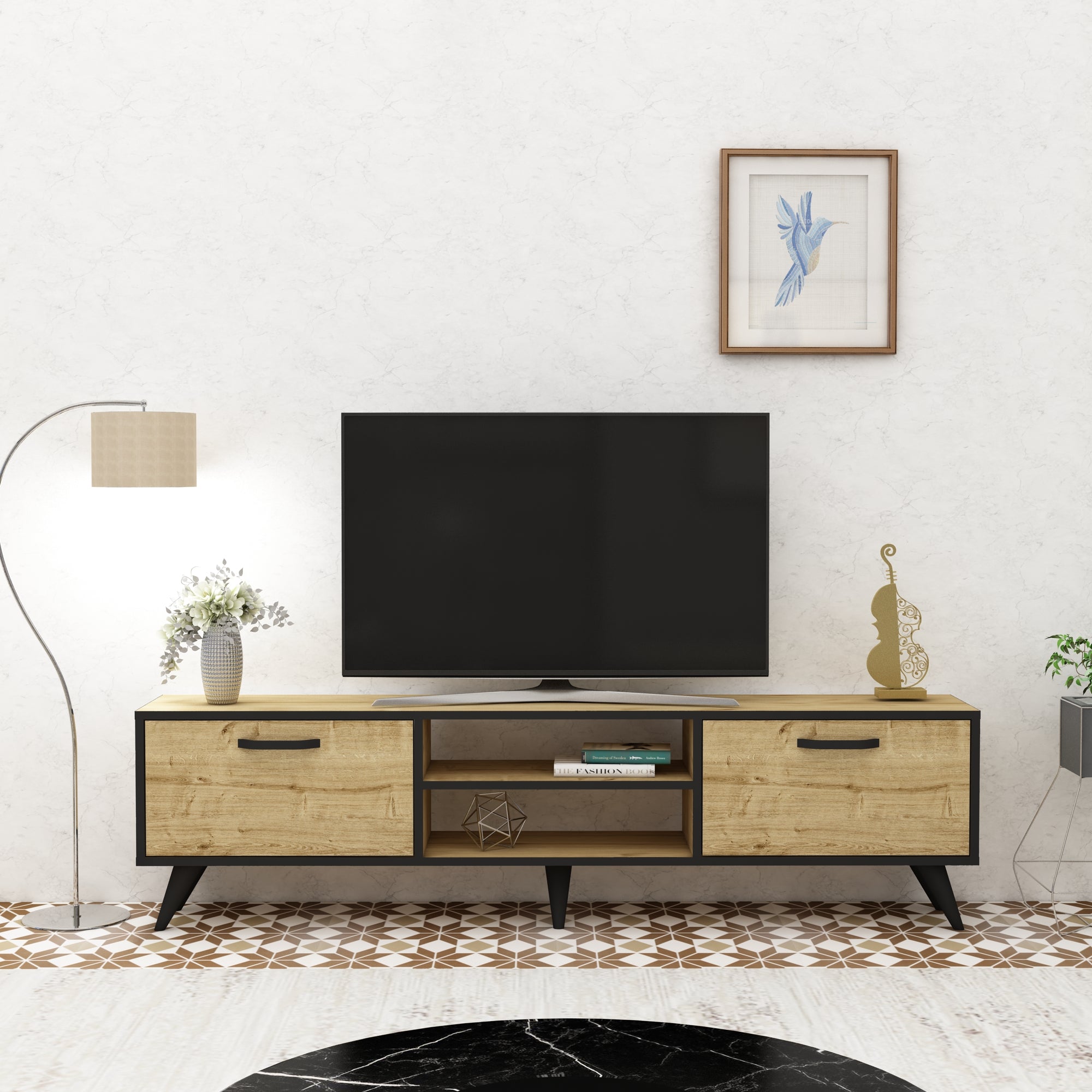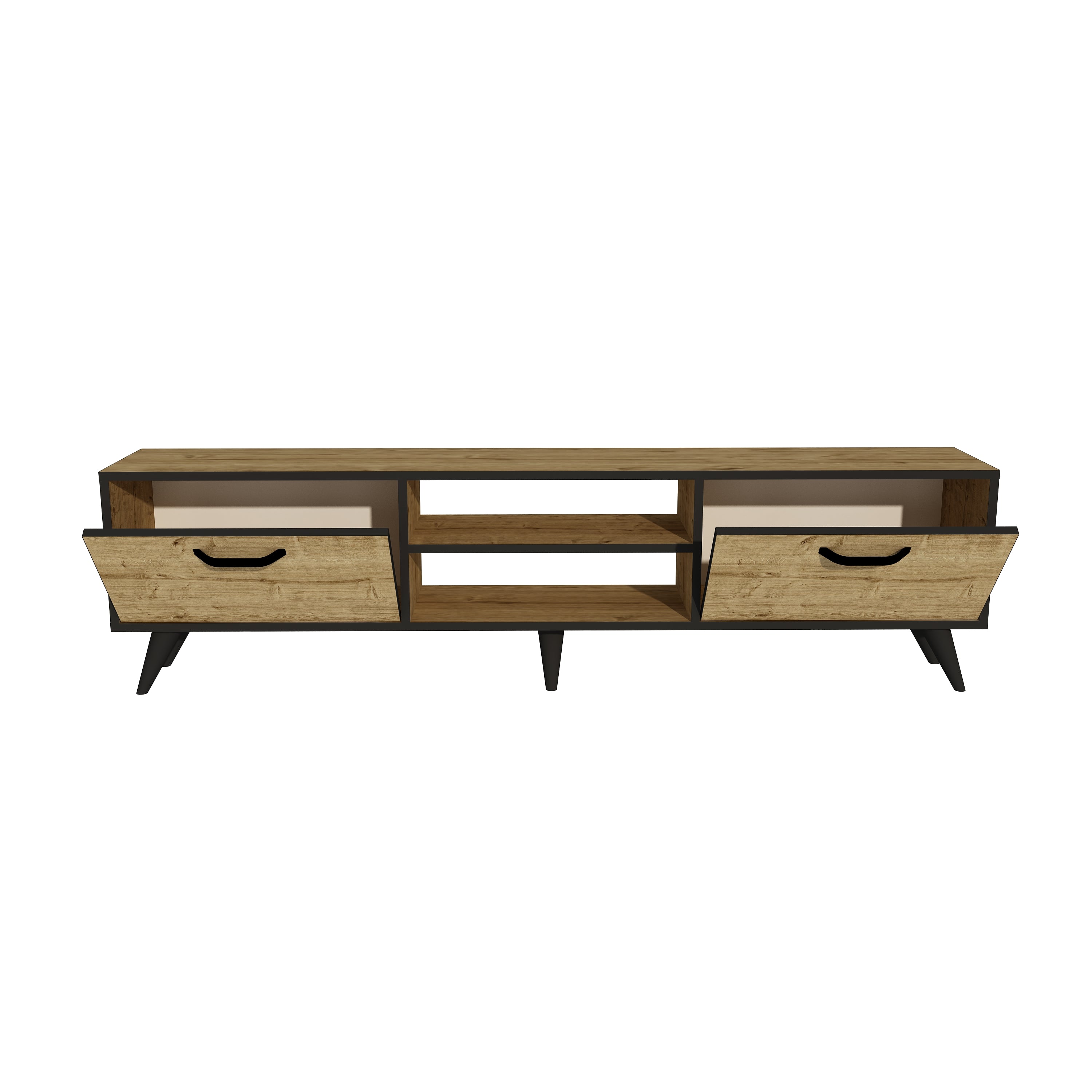 Komoda za TV Nirvana unosi toplinu dekora hrasta u kombinaciji s crnim akcentima, pružajući savršen spoj prirodnog izgleda i savremenog dizajna. S dvije fioke i dvije centralne police, ovaj komad nudi praktično rješenje za skladištenje uz jednostavan vizuelni balans.