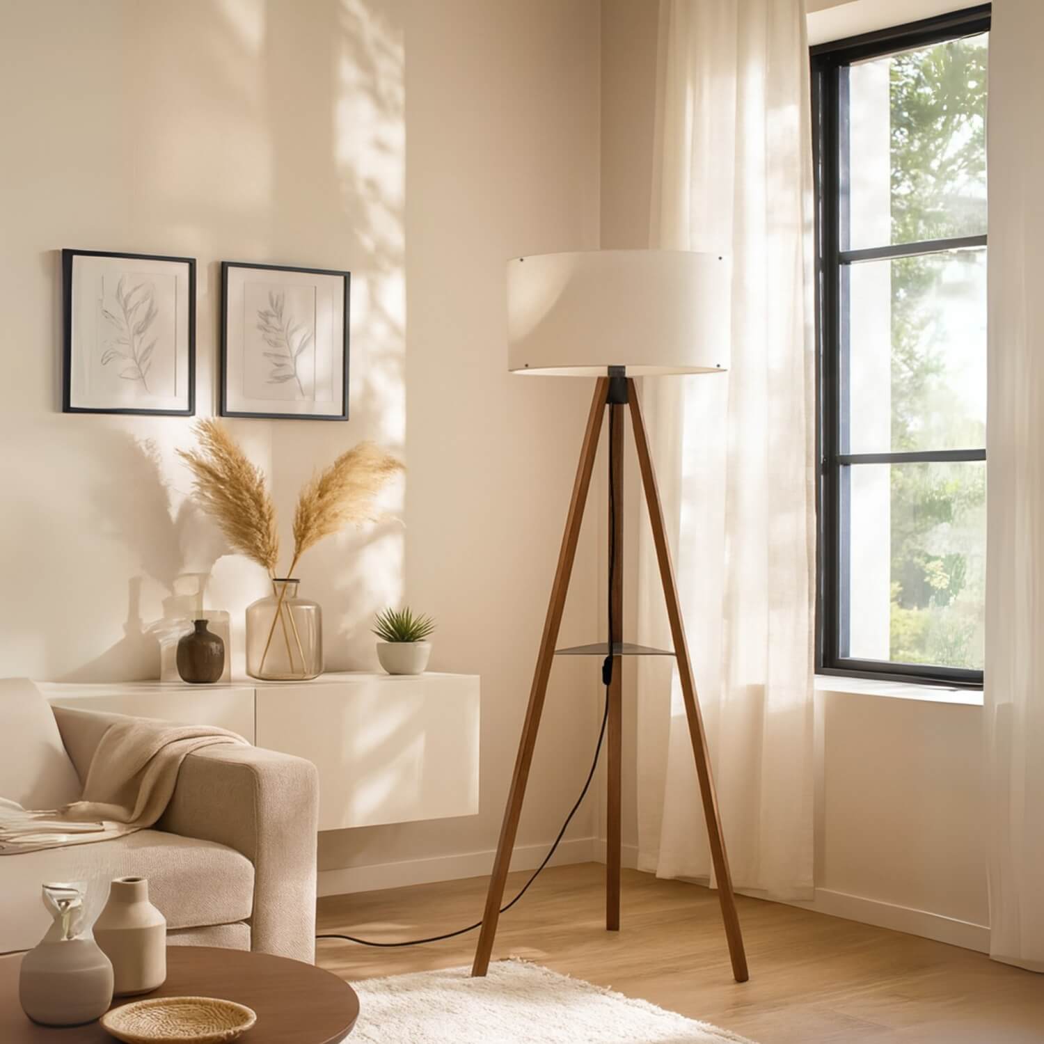 ✅ Elegantan i ugodan vizualni dojam: Kombinacija bijelog abažura i tri elegantne, smeđe MDF noge koje se šire unosi izrazitu toplinu i cozy osjećaj u prostor.