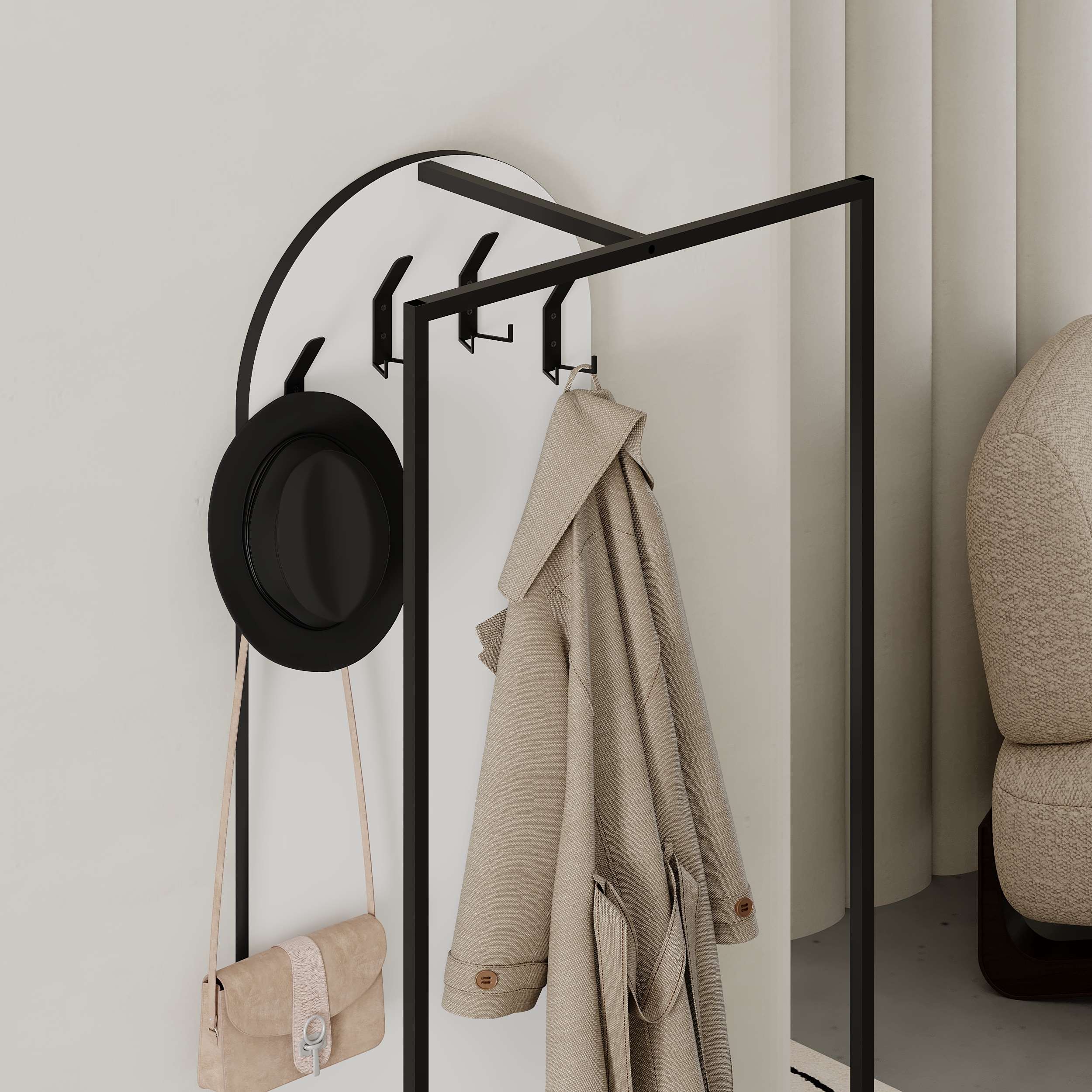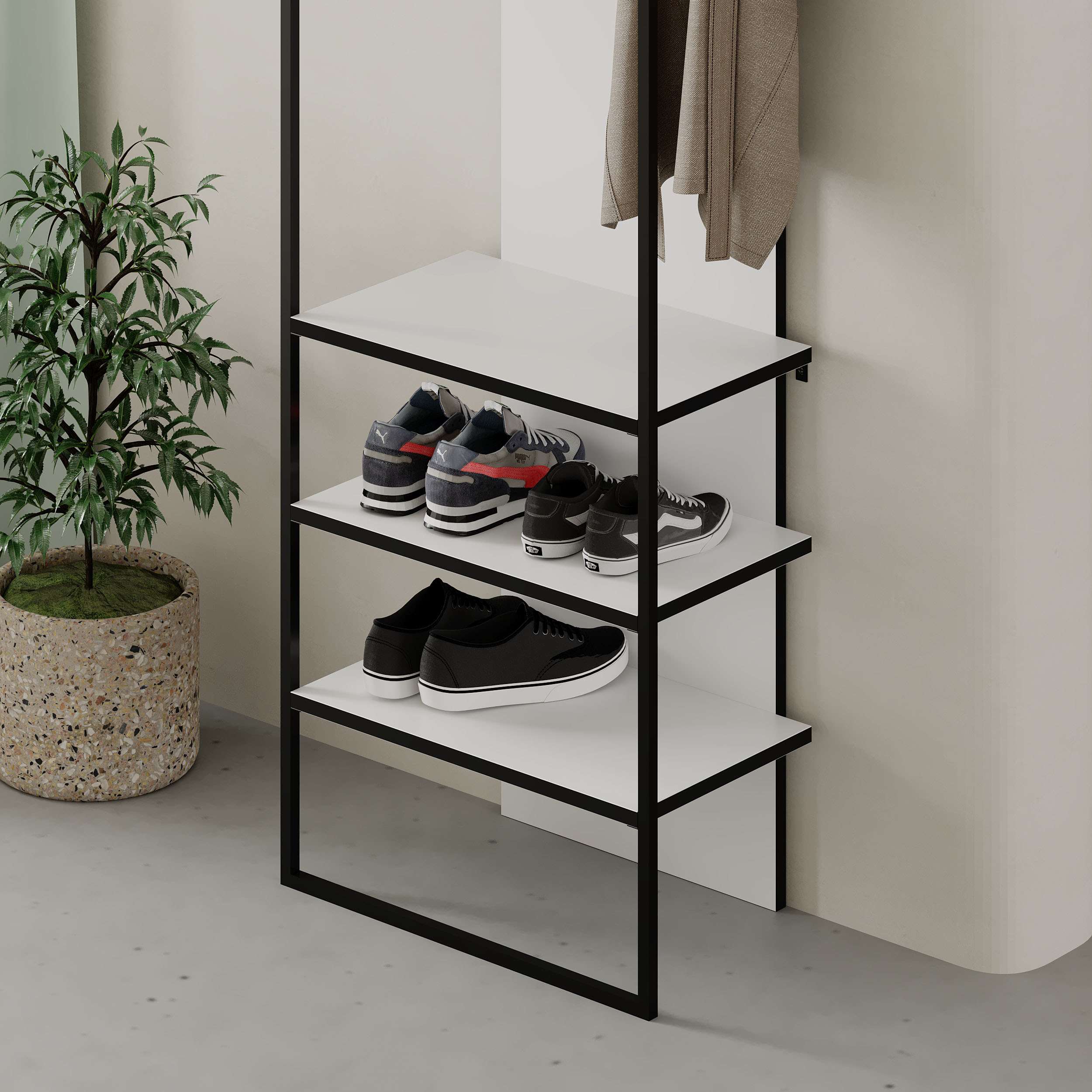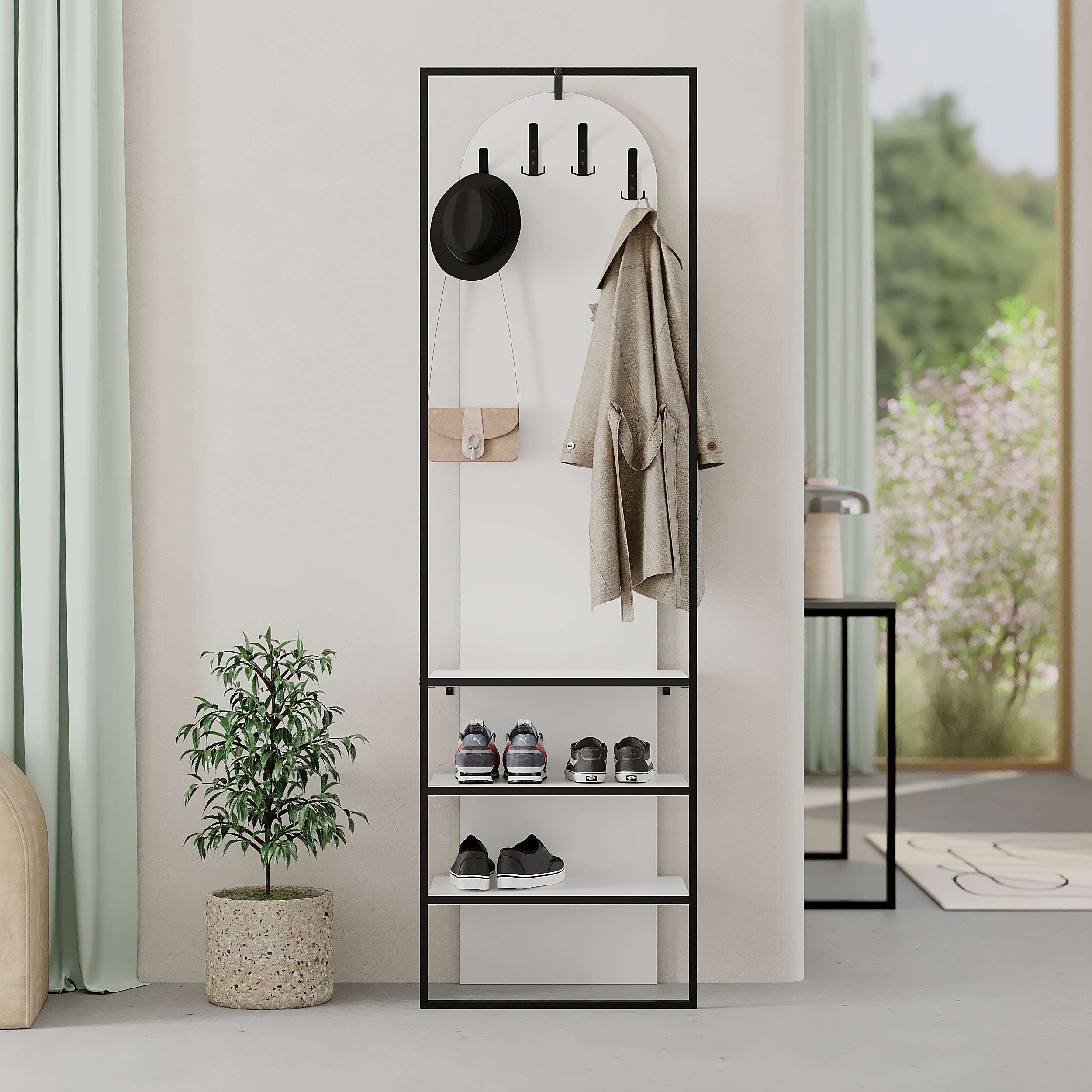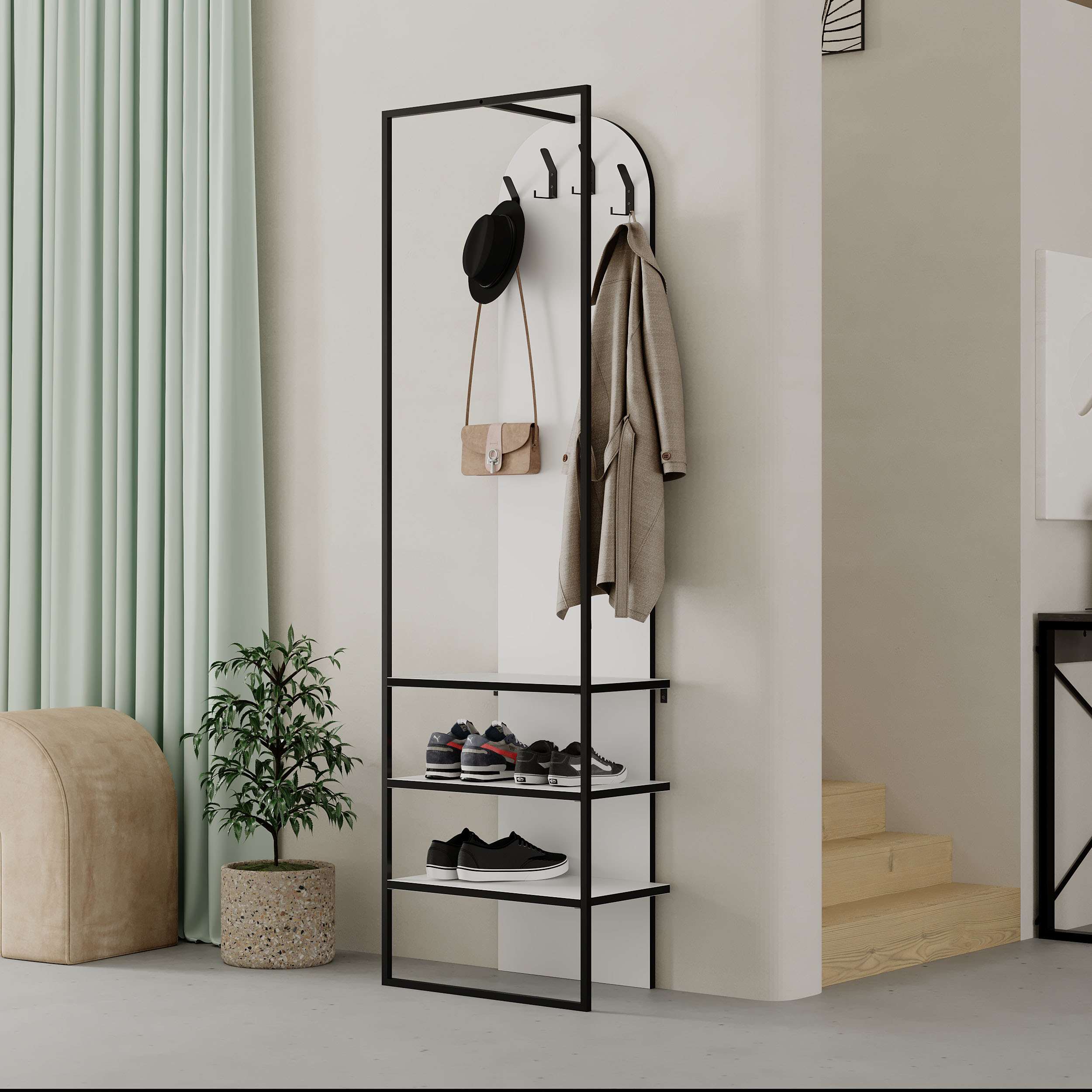 ✅ Sveobuhvatna organizacija – pri vrhu se nalazi bijela (ili u boji hrasta) ploča s četiri čvrste crne kukice, savršene za jakne, kapute, šešire ili šalove. Ispod se nalaze tri prostrane bijele police, idealne za uredno odlaganje cipela, dok se crne šine koje podržavaju cijelu strukturu protežu s obje strane, dajući predsoblju moderan i stabilan izgled.