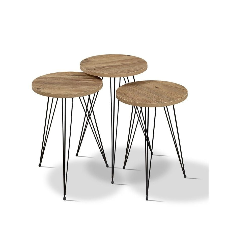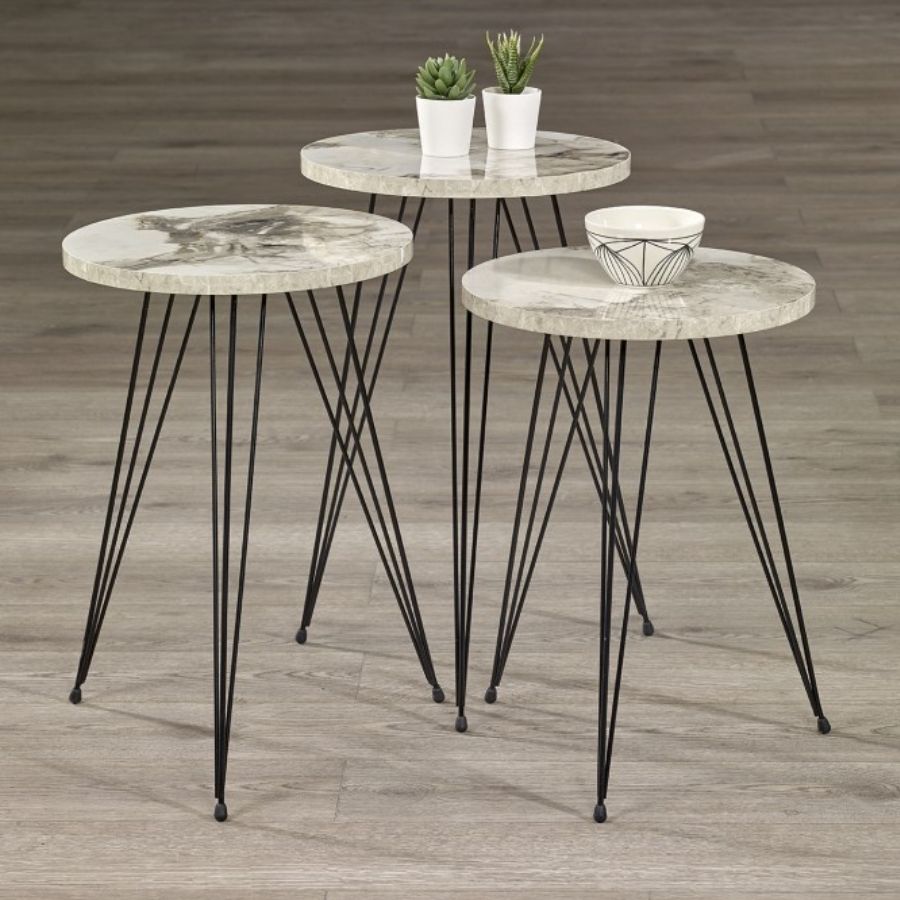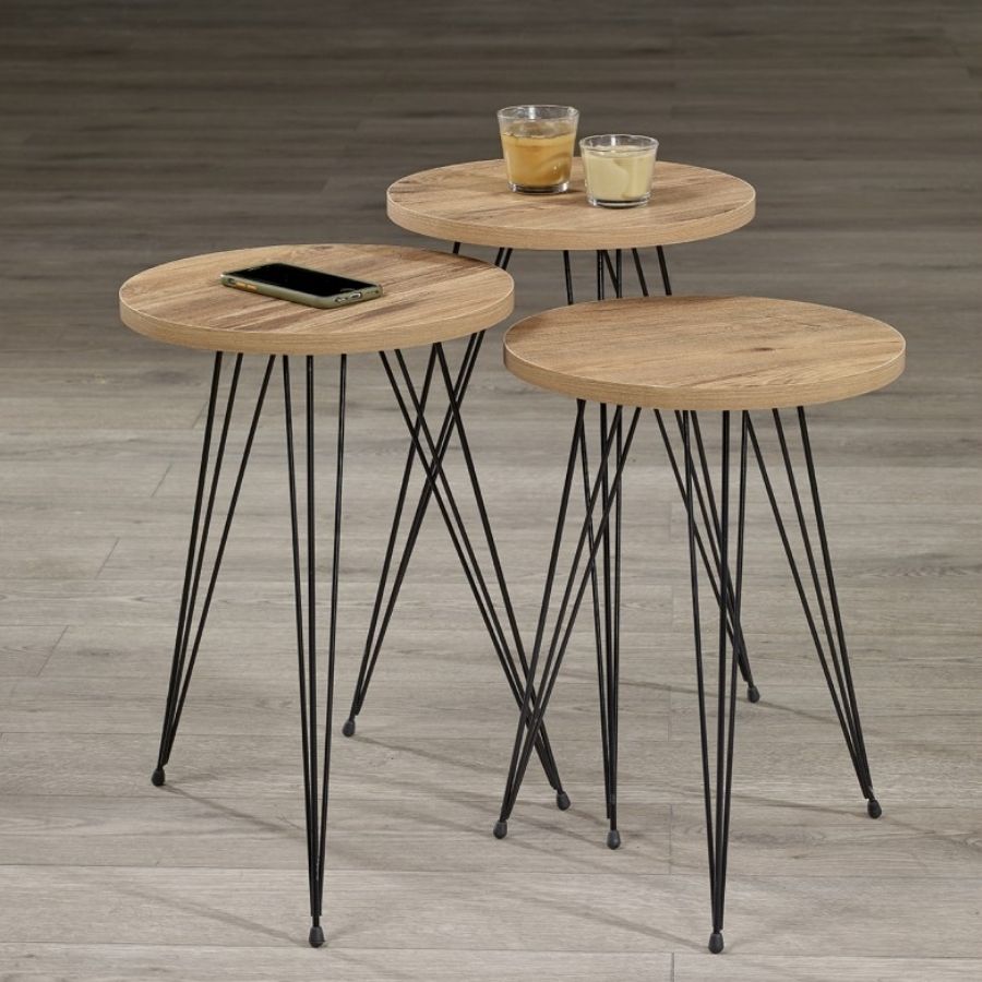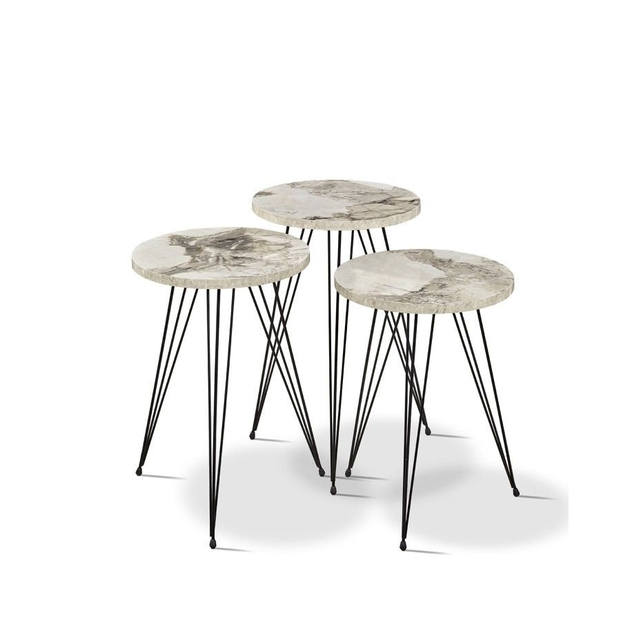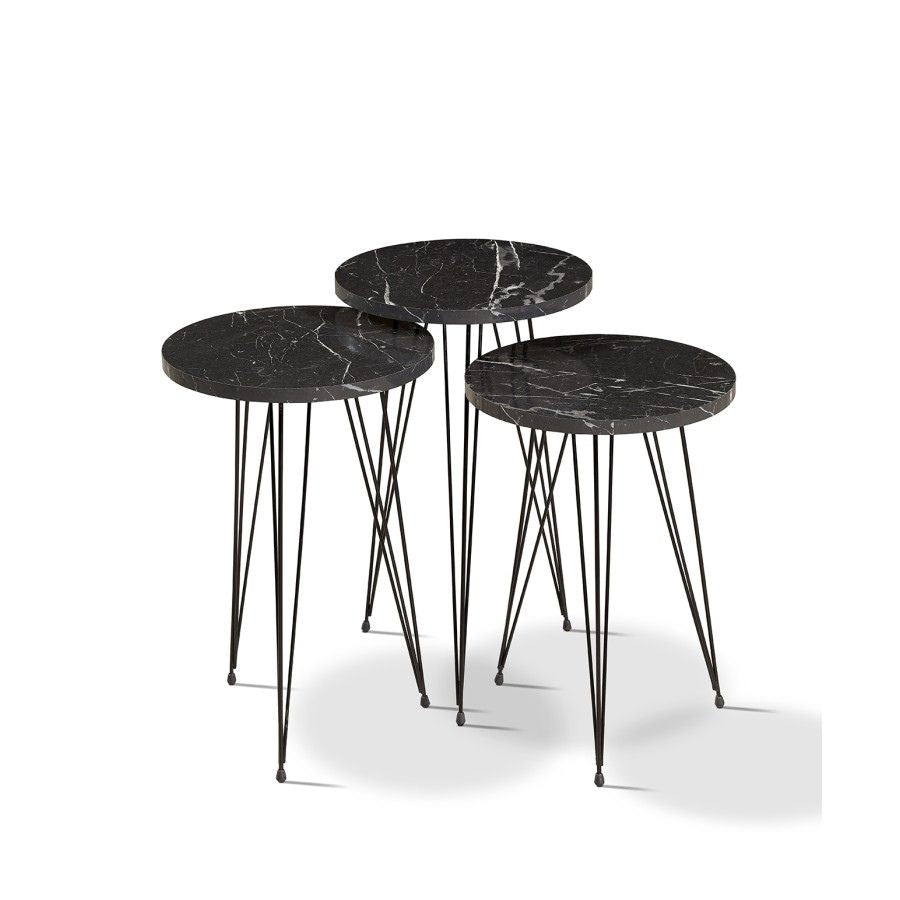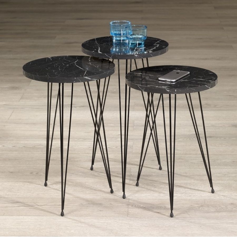 Tri mala stola istih dimenzija, svaki u obliku kruga i sa tri crne noge. Praktični, moderni i savršeni za manji prostor.