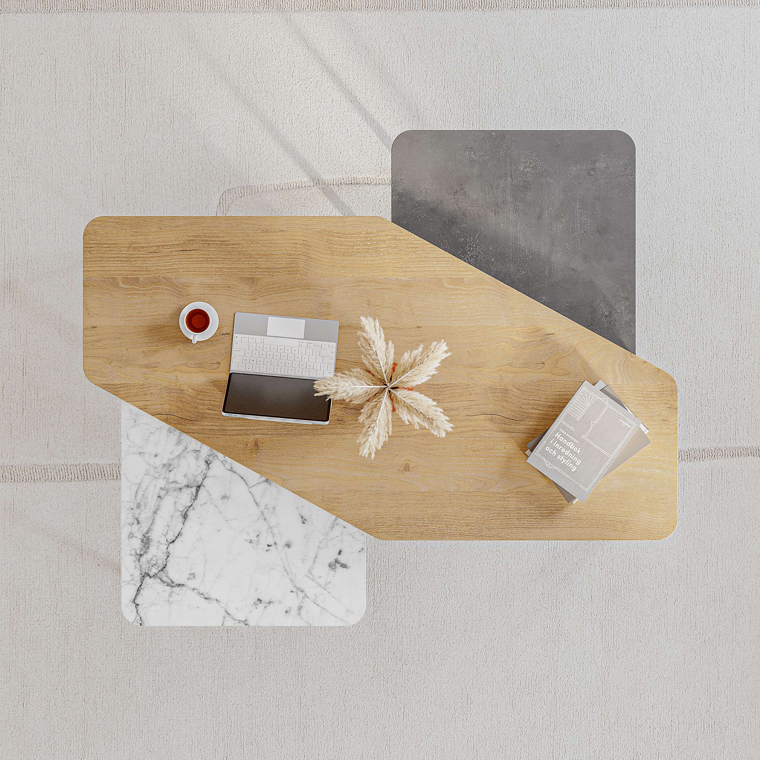 ✅ Vizuelna dinamika – jedan sto neobičnog oblika (pravougaonik s izrezanim uglovima), dok su dva manja kvadratna