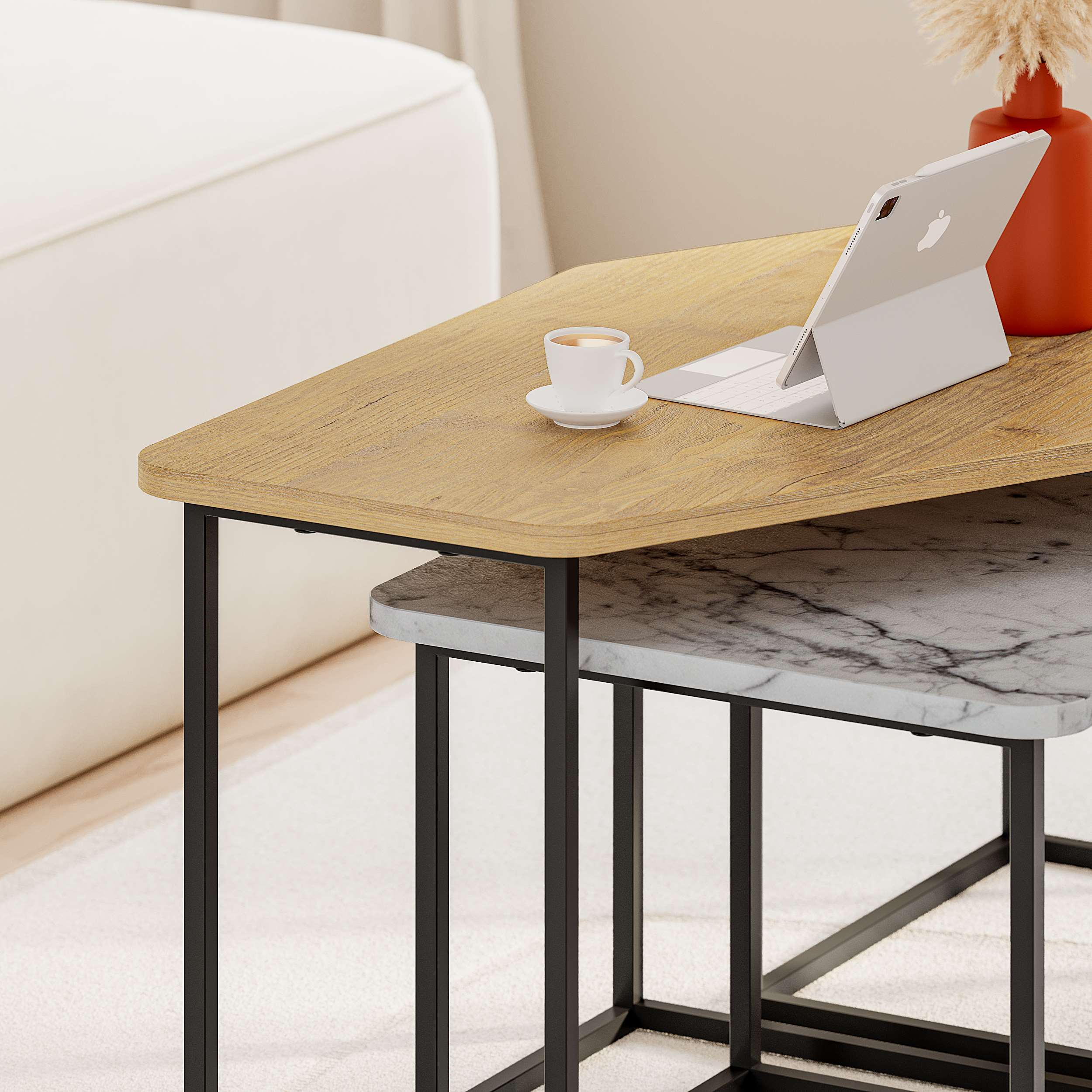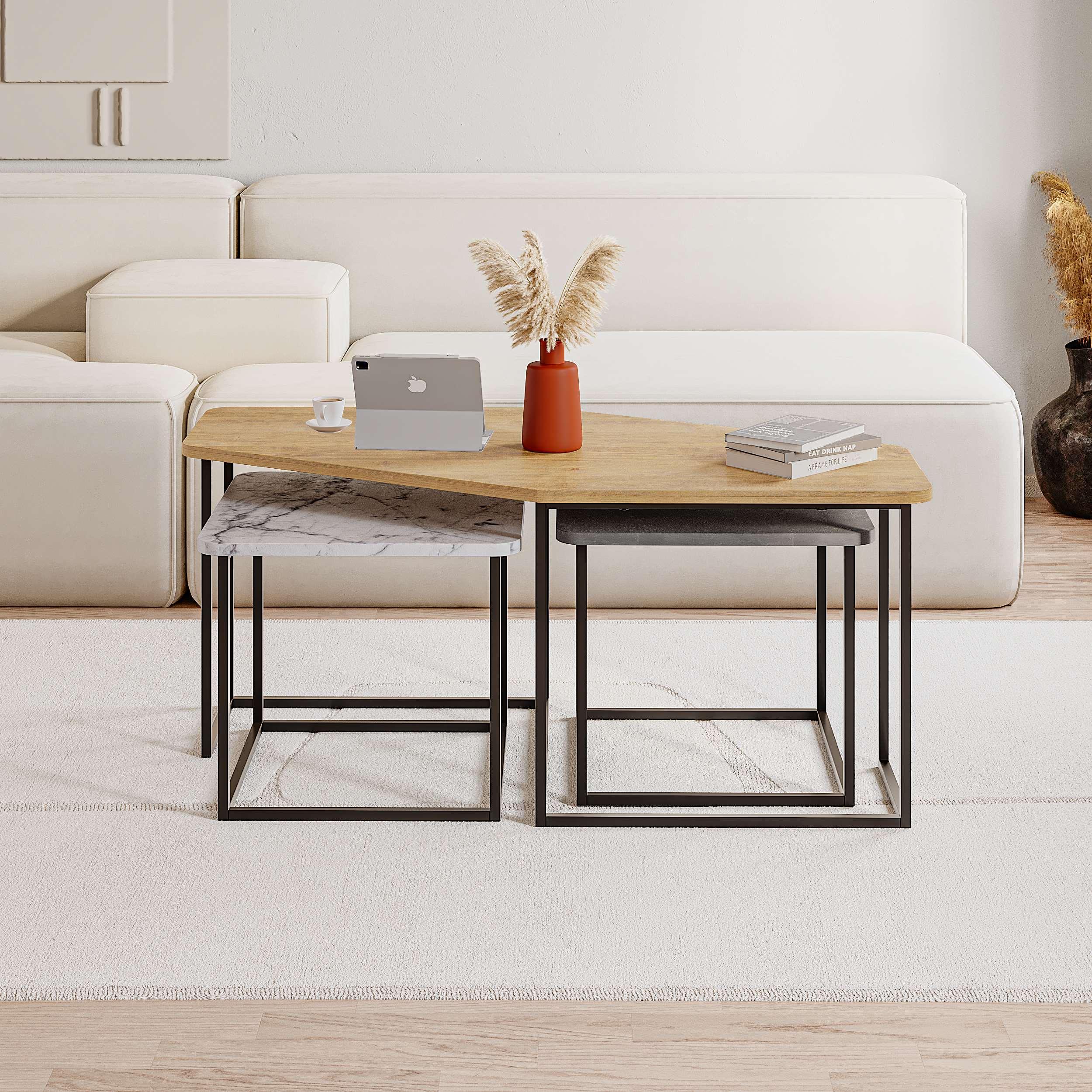 ✅ Kombinacija materijala – hrast na većem stolu, dok su manji sa bijelim mermerom i sivom bojom