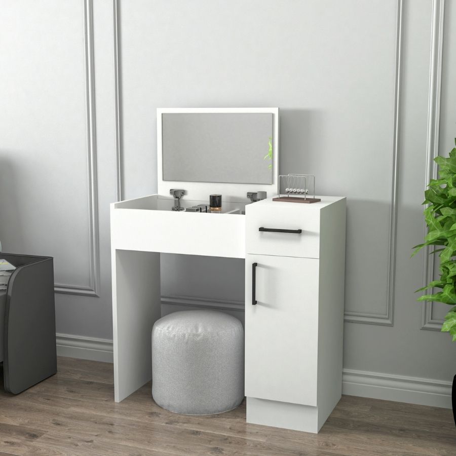 ✅ Pametan, višenamjenski dizajn – na desnoj strani stola nalazi se dio koji se elegantno otvara prema gore i otkriva praktično ogledalo te tri manje police, idealne za šminku, nakit ili manje potrepštine koje želite imati pri ruci. Kad je zatvoren, stvara čistu, neprekinutu površinu (visina 73,8 cm).