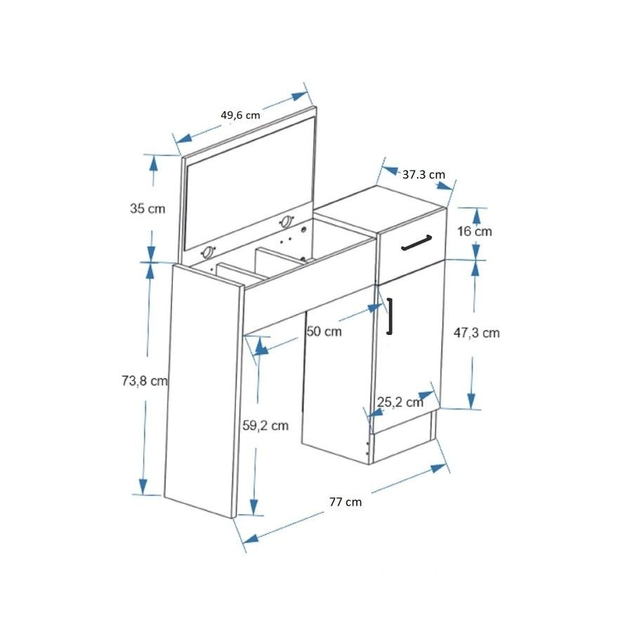 ✅ Kompaktan i funkcionalan – dimenzije 77 x 37,3 cm čine ga idealnim za različite prostore, dok visina od 73,8 cm (zatvoreno) do 35 cm (otvoreno s ogledalom) pruža fleksibilnost i udobnost pri korištenju.
