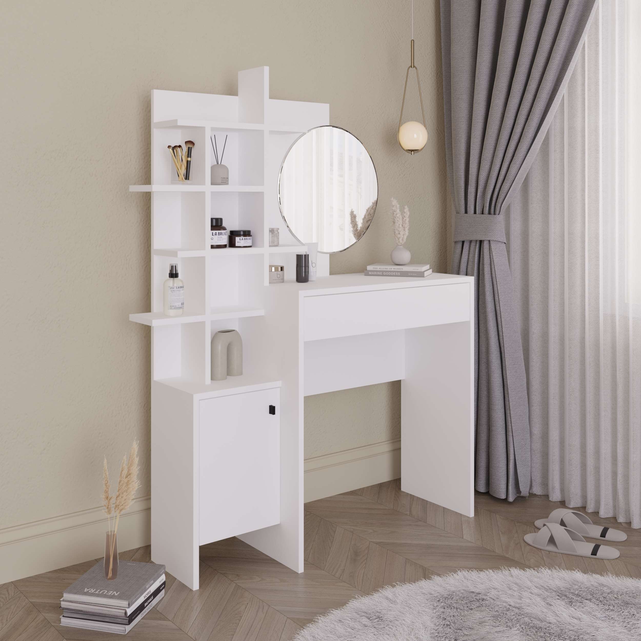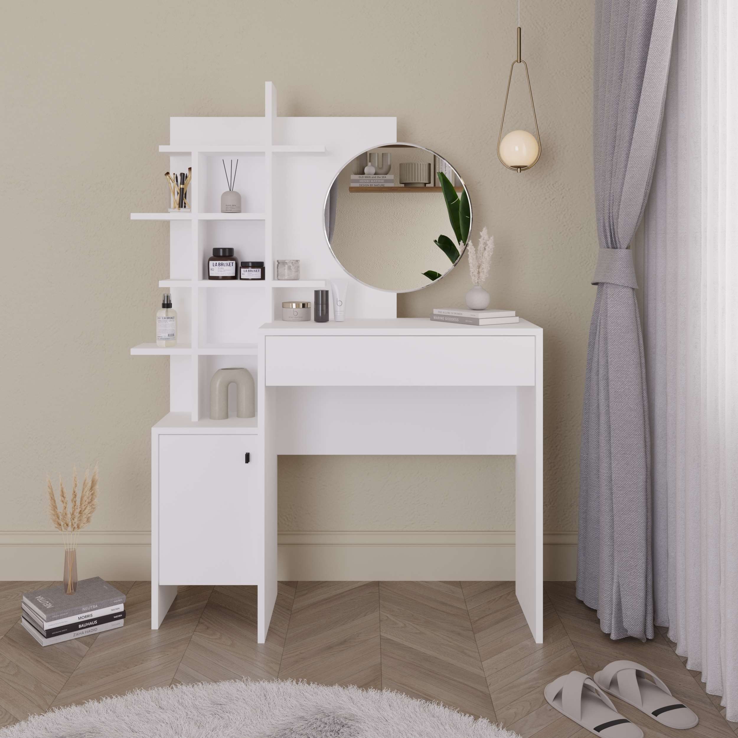 Tražite toaletni stolić koji će vam pružiti obilje prostora za pohranu, pametnu organizaciju i elegantno mjesto za uljepšavanje? Naš Toaletni Sto Mup je ultimativno rješenje za moderne domove! Njegov prostran dizajn s mnoštvom polica, ladica i integriranim okruglim ogledalom čini ga savršenim za spavaće sobe, garderobe ili veće predsoblja – sve što vam treba na dohvat ruke!
