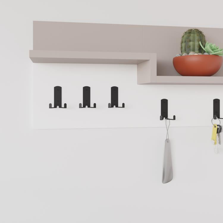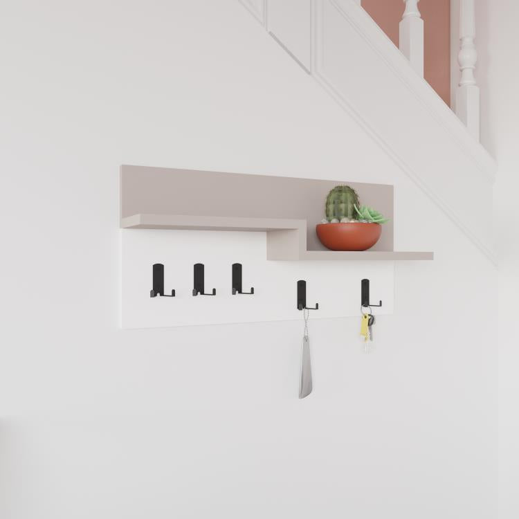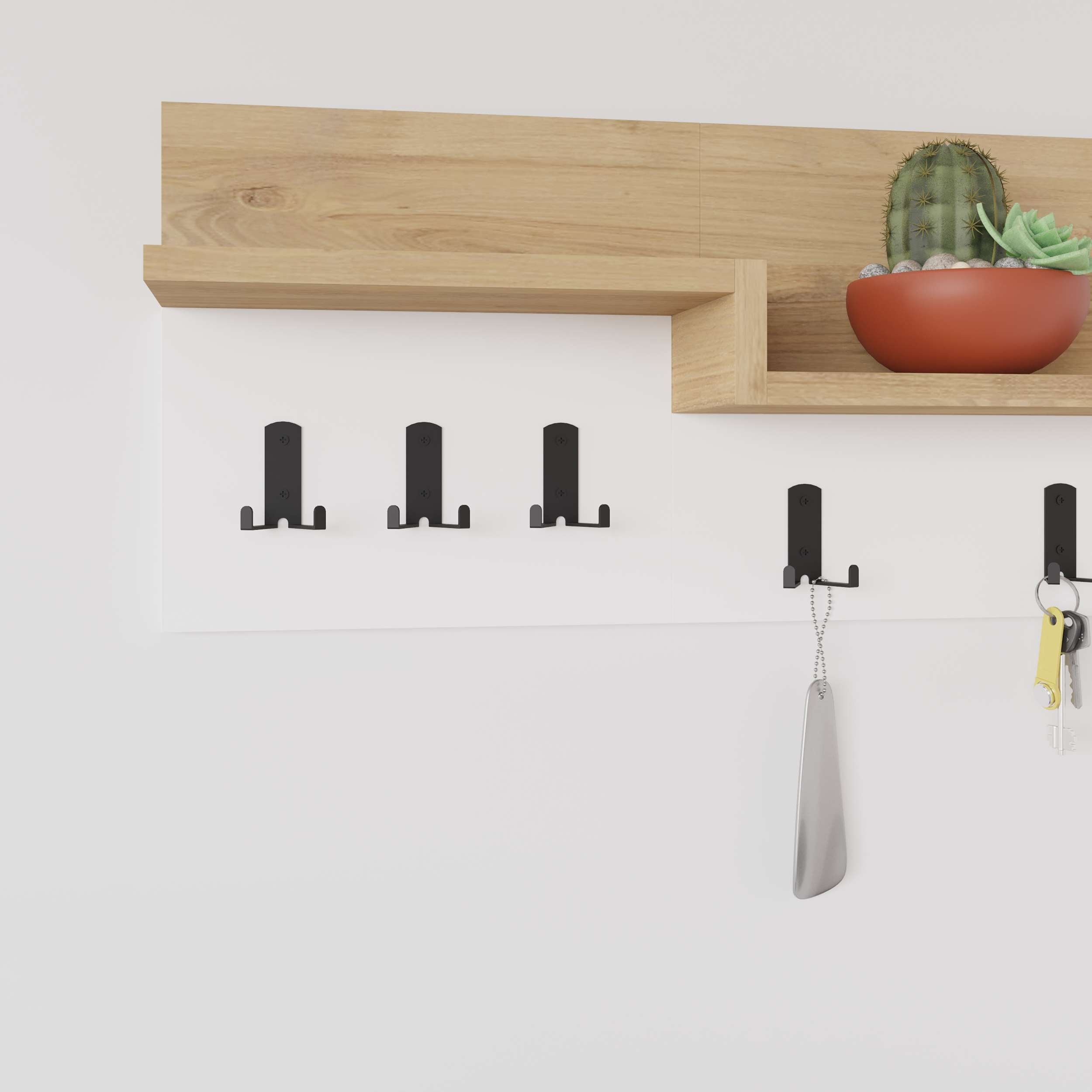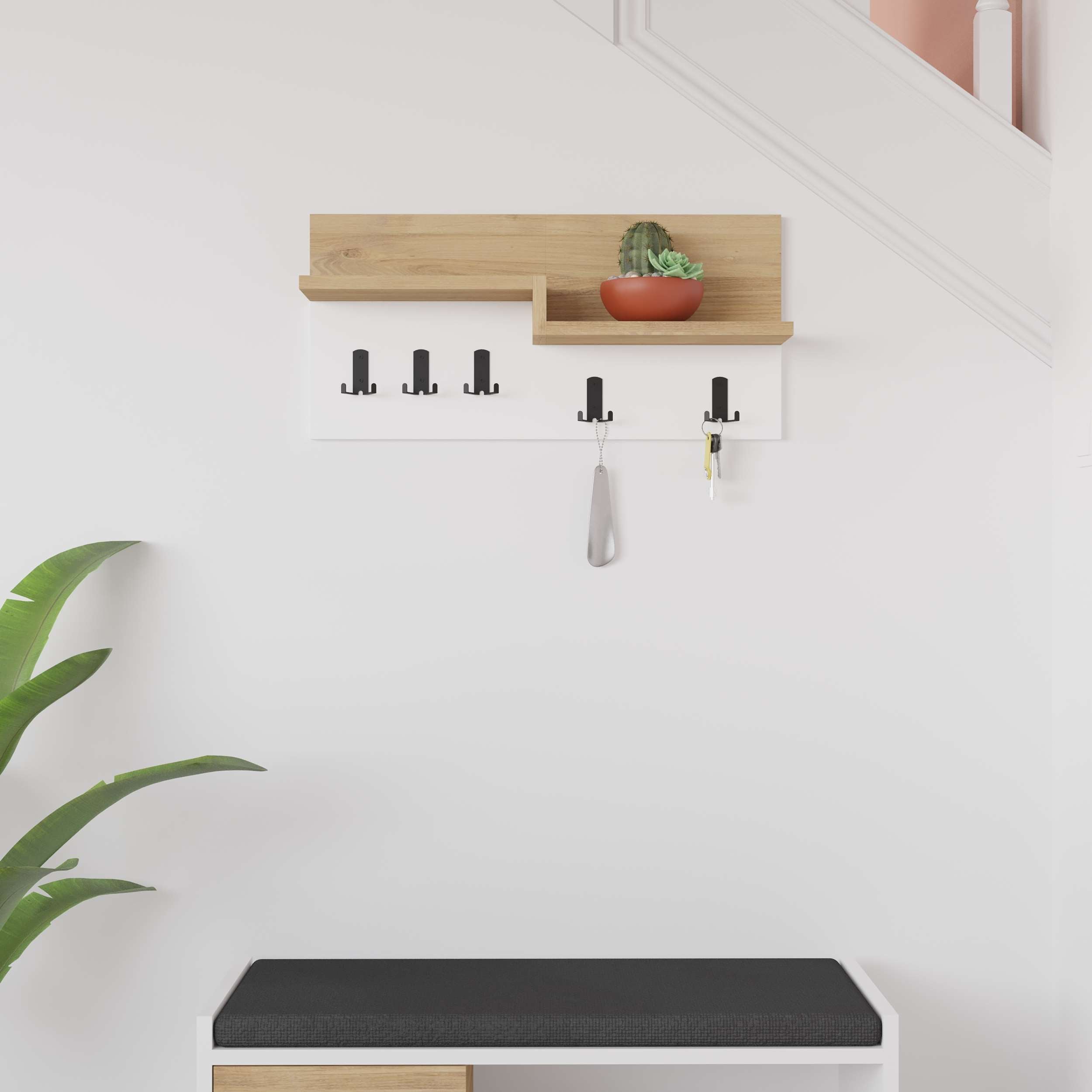 ✅ Praktična kombinacija – gornja površina nudi elegantnu policu u boji sonomo drveta, idealnu za odlaganje ključeva, telefona, manjih torbi ili dekoracija. Ispod se nalazi bijela ploča s pet čvrstih kukica, savršenih za jakne, kapute ili marame.