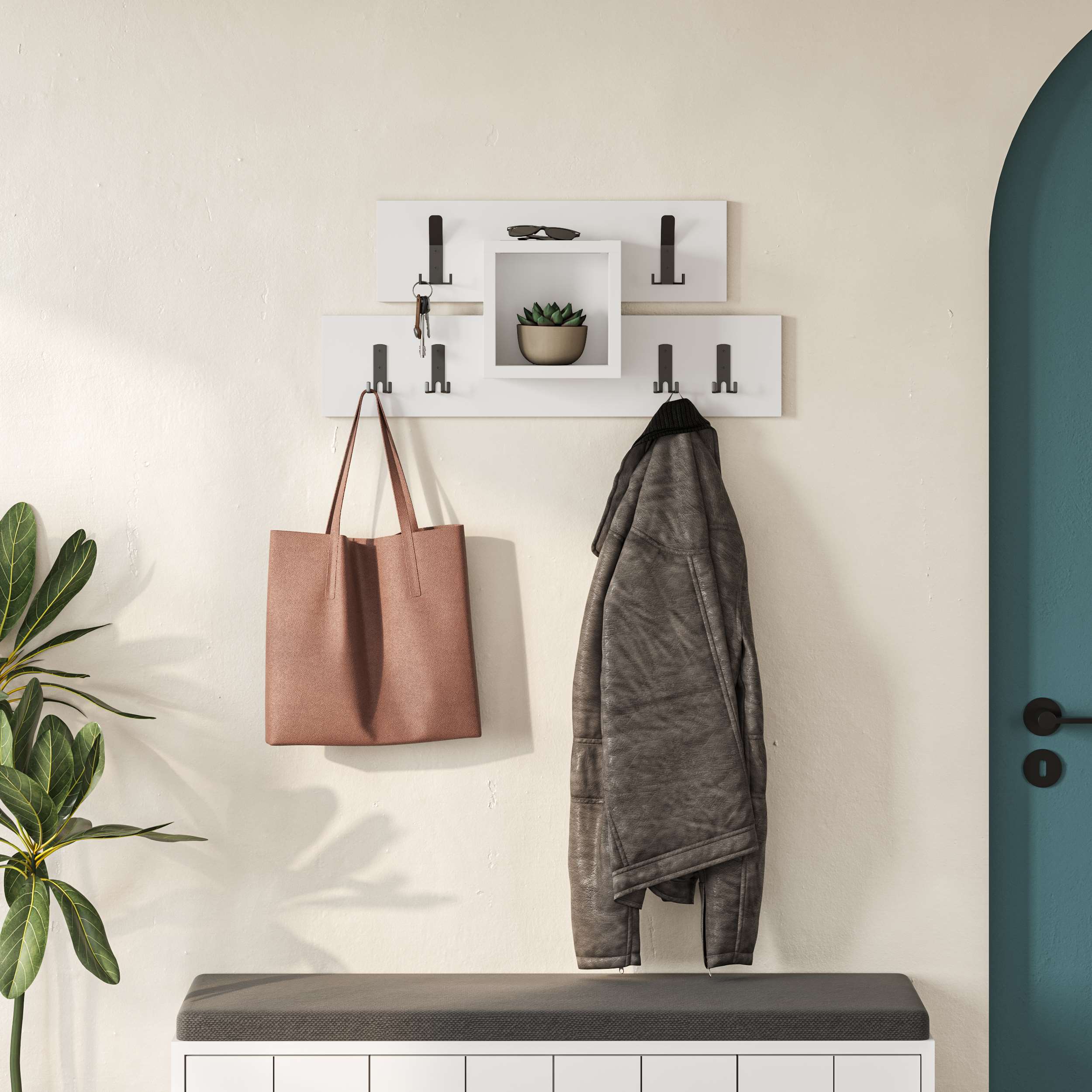 ✅ Pametna centralna polica – u sredini vješalice nalazi se kvadratna polica, čija se gornja površina takođe može koristiti za odlaganje ključeva, novčanika, pošte ili manjih dekoracija, pomažući vam da održite urednost.